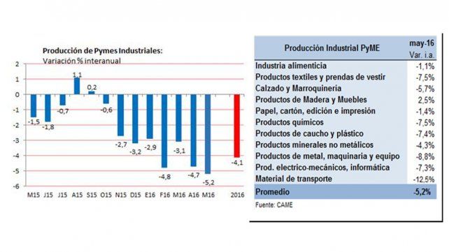 La producción de las PyMES Industriales cayó 5,2% en mayo frente a igual mes del año pasado y acumula un retroceso anual de 4,1% en los primeros cinco meses del año. En la comparación mensual (mayo 2016 vs abril 2016) se registró un retroceso de 7,1%.