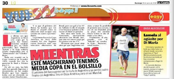 ¿Qué sucedió? El diario chileno La Cuarta publicó un artículo en su edición papel de este domingo en el que se refieren a Javier Mascherano, referente del equipo de Gerardo Martino, como "mufa"."Mientras esté Mascherano tenemos media Copa en el bolsillo", titula la nota en la que se hace alusión a las cuatro finales que perdió el jugador del Barcelona actuando para la Selección argentina.
