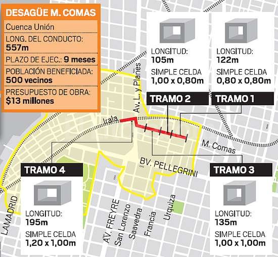 Los trabajos beneficiarán a 2.500 vecinos, tienen un plazo de ejecución de nueve meses y corresponden a la denominada Cuenca Unión, que se extiende desde calle 4 de Enero hasta la intersección de la avenida López y Planes con pasaje Irala. Consiste en la ejecución de un desagüe troncal por calle Mariano Comas, entre Urquiza y avenida López y Planes.