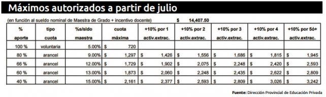 Como el Ministerio de Educación de la provincia fija los topes para las cuotas de los colegios privados en función de una ecuación que toma como base el salario del maestro de grado sin antigüedad –también llamado cargo testigo–, cada vez que se liquida una nueva etapa de aumento se habilita una suba de los máximos.