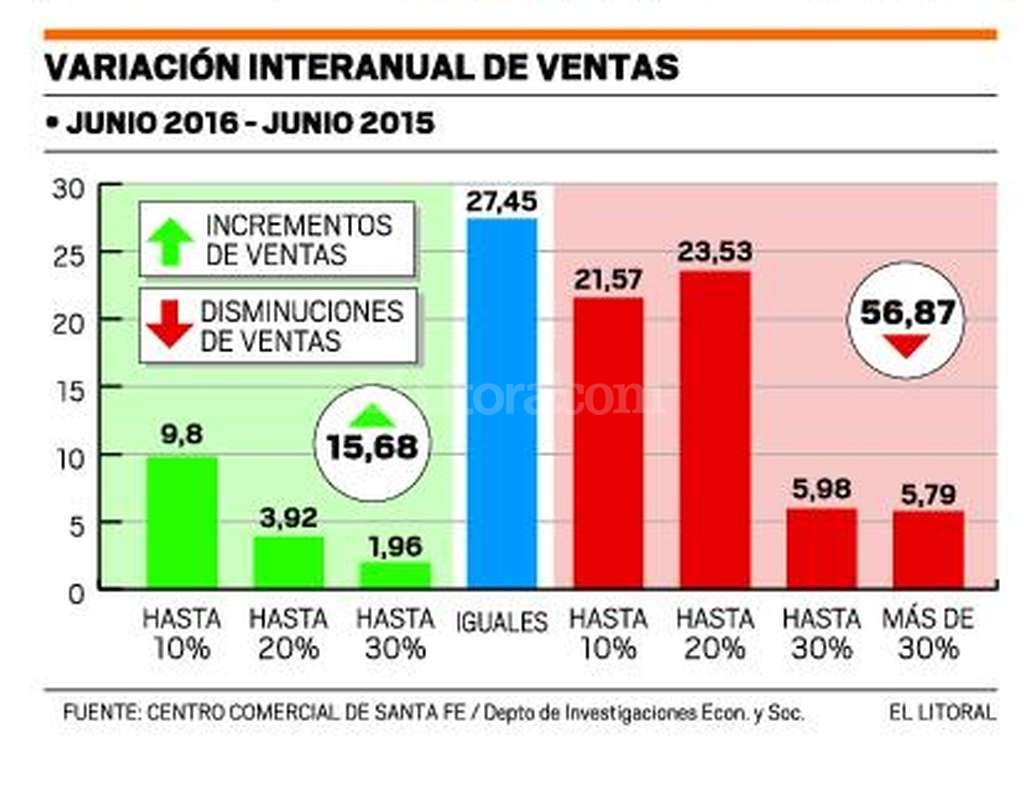 Si bien el relevamiento indica que persiste un preocupante descenso en esos niveles interanuales de ventas (el 56,87% de los comerciantes vendió menos que en junio de 2015), la entidad señala que el 27,45% de los encuestados vendió igual que el año pasado, y el 15,68% superó las ventas del mismo mes del año pasado.