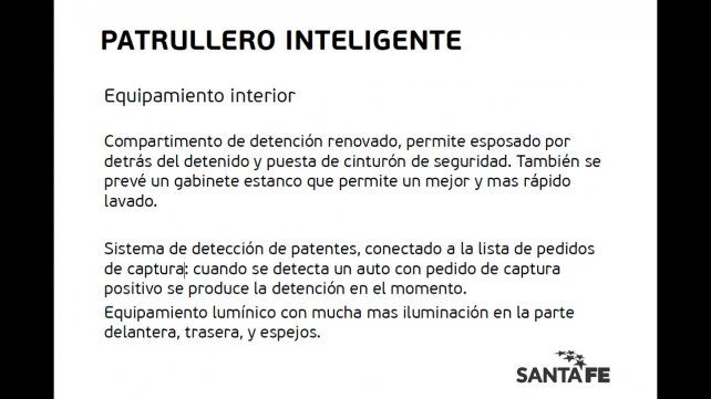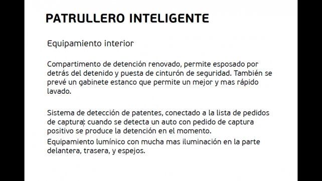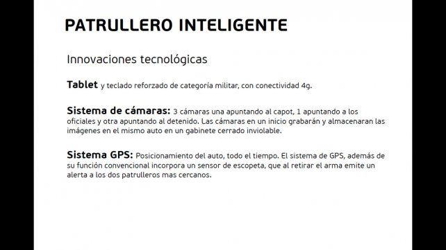 Sistema de cámaras: 3 cámaras una apuntando al capot, 1 apuntando a los oficiales y otra apuntando al detenido. Las cámaras en un inicio grabarán y almacenarán las imágenes en el mismo auto en un gabinete cerrado inviolable.